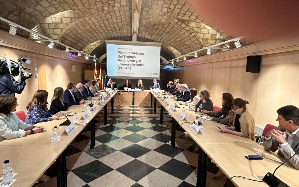 La vicepresidenta de Aragón y la directora general de Pymes y Autónomos, Ana Sanz, han presentado el PETAE junto a los miembros del Consejo del Trabajo Autónomo de Aragón (CATA), del Consejo Asesor de Emprendimiento de Aragón, agentes sociales y directores generales como los de Trabajo, el Instituto Aragonés de Fomento y el INAEM, en un acto que ha tenido lugar en la Sala Hermanos Bayeu del Edificio Pignatelli de Zaragoza.
