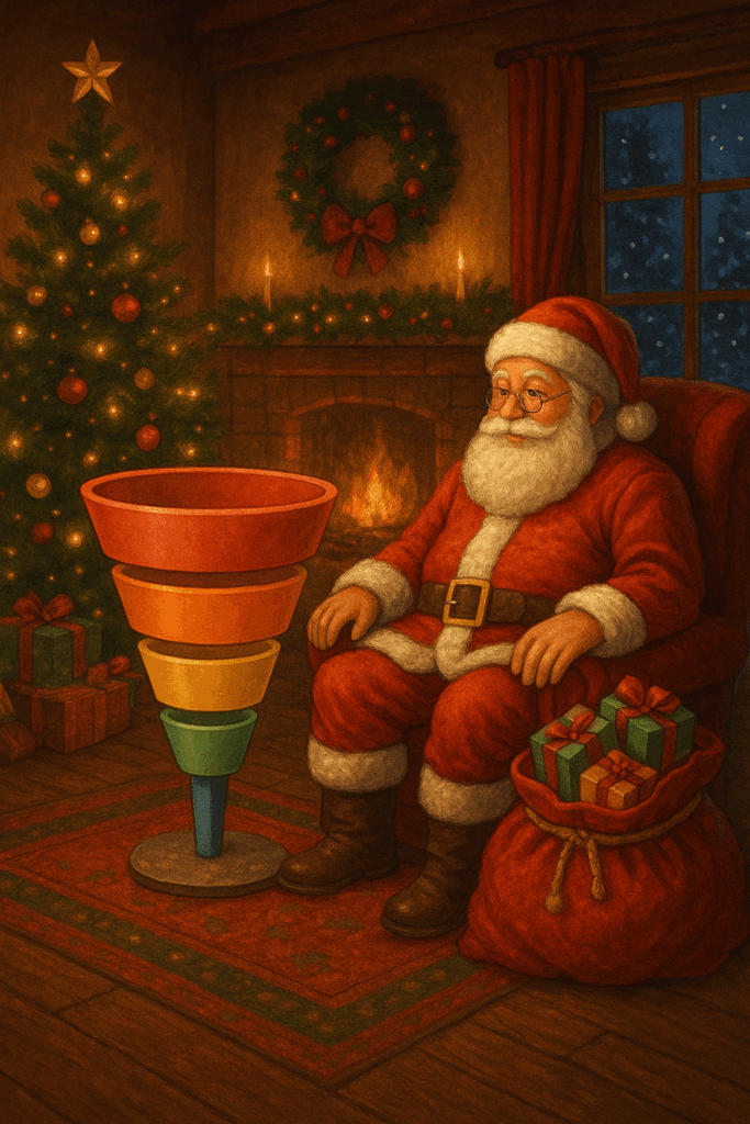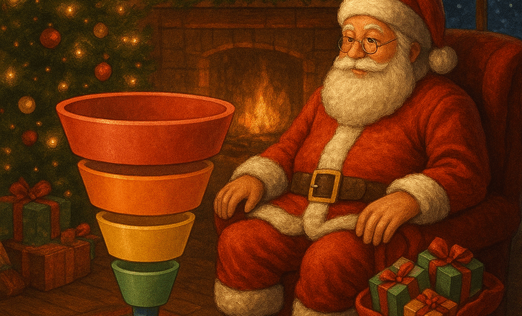 - ¡Eso es! – siguió Ana – Ya está el embudo de conversión completo. Va a resultar que los de marketing os habéis copiado de él – añadió burlona – buscáis la satisfacción del cliente perpetuamente, como él, y además de la manera más rápida posible. Pero lo tenéis difícil porque Papa Noel lo hace en una sola noche… es mágico.