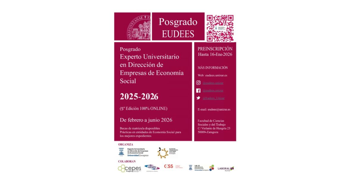 La Universidad de Zaragoza ha abierto el periodo de preinscripción del Posgrado Experto Universitario en Dirección de Empresas de Economía Social (EUDEES), la formación de referencia en Aragón y en España para quienes desean impulsar proyectos transformadores desde la Economía Social. El título celebrará en 2026 su 20ª edición y se impartirá del 6 de febrero al 24 de junio, en modalidad 100 % online, lo que facilita la participación de alumnado desde cualquier municipio y la compatibilización con trabajo y vida familiar.