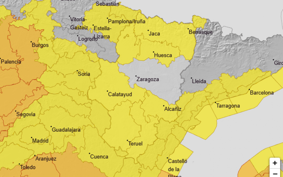 - Nevadas en el Pirineo, entre las 00:00 y las 18:00 horas; en Albarracín y Jiloca, de 06:00 a 18:00 horas; y en el centro de Huesca y las Cinco Villas, entre las 10:00 y las 20:00 horas.