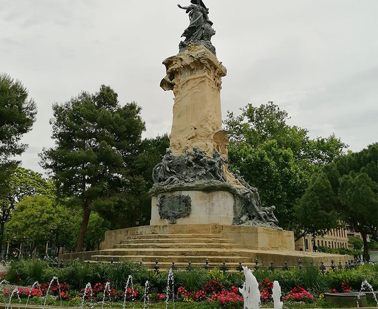 Su construcción fue promovida por una serie de notables de la ciudad, entre los que destacaba el industrial oscense Basilio Paraíso, director de la Cámara de Comercio. El Monumento se ubicaba en el centro de la avenida principal de la Exposición Hispano Francesa de 1908, ubicado en la entonces llamada Huerta de Santa Engracia (que incluía la actual plaza de los Sitios).