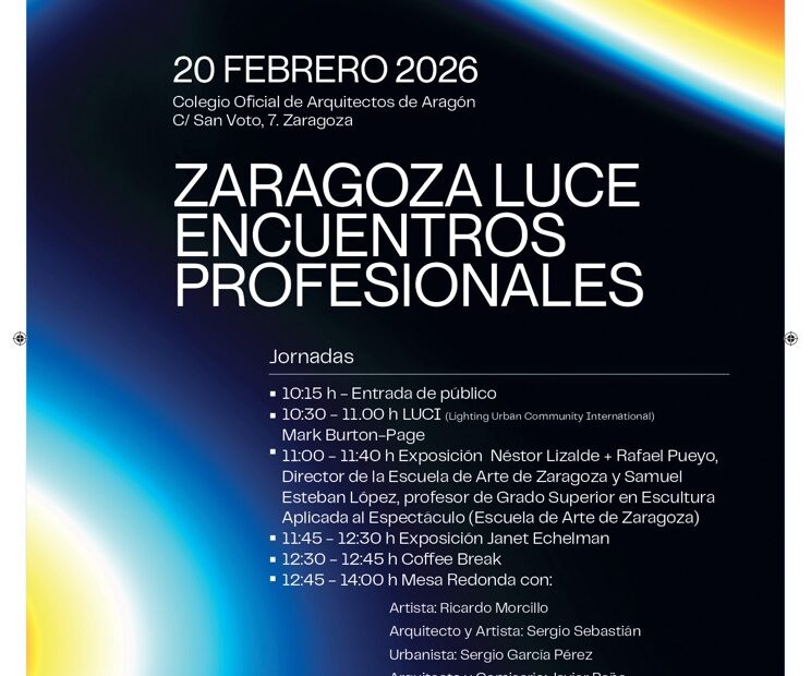 El próximo 20 de febrero el Colegio Oficial de Arquitectos de Aragón (COAA) acogerá los Encuentros Profesionales de Zaragoza Luce, una jornada dirigida a profesionales del ámbito artístico, arquitectónico y urbanístico que consolidará al festival como espacio de reflexión e intercambio en torno a la luz como herramienta de transformación urbana.