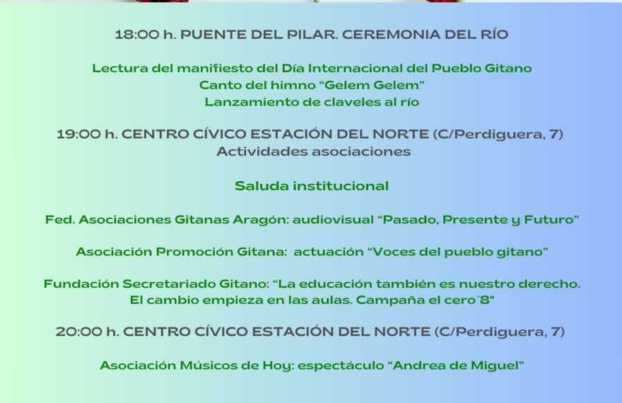 La Ceremonia del Río y una programación cultural en el Centro Cívico Estación del Norte centran los actos promovidos por las asociaciones gitanas y el Ayuntamiento de Zaragoza El Ayuntamiento de Zaragoza se suma un año más a la conmemoración del Día Internacional del Pueblo Gitano, que se celebra en todo el mundo el próximo […]