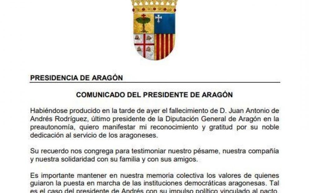 Las banderas de los edificios oficiales ondearán a media asta hasta las 12 horas del próximo sábado, 17 de enero El presidente Azcón ha declarado tres días de luto oficial por el fallecimiento del presidente Juan Antonio de Andrés Rodríguez, último presidente de la Diputación General de Aragón